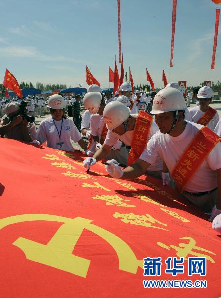 6月28日,工地上的党员建设者签名开展迎接建党89周年争创先进活动。当天,正在建设中的兰(州)新(疆)铁路二线工程新疆段举行了建党89周年纪念及党员突击队授旗仪式。参加该工程建设的中国中铁四局近千名建设者隆重宣誓,以共产党员的先锋模范带头作用,克服施工困难,高质量严要求地完成国家重点建设工程。新华社记者王雷摄