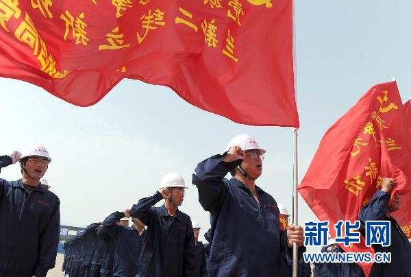 6月26日,参加创先争优的中国中铁四局党员代表进行创先争优宣誓。新华社记者王雷摄