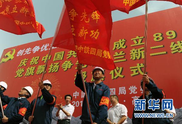 6月26日,来自中铁四局工程建设一线的党员代表接过创先争优旗帜。新华社记者王雷摄