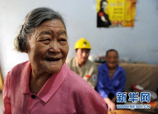 6月22日,在成都肖家河社区黄家明老人家中,82岁的黄家明(左一)感谢上门服务的成都电业局共产党员服务队队员。82岁的黄家明老人是低保户,由于儿女不在身边,电力共产党员服务队的队员便经常上门服务帮助她解决生活中的困难。新华社记者陈凯摄