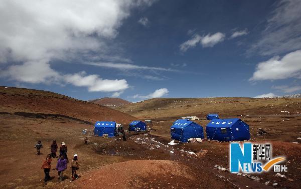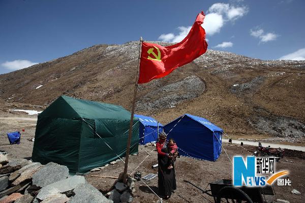 当日,记者从青海玉树县结古镇前往隆宝镇采访,一路上发现,无论是在路边的灾区群众安置点还是深山草甸,都能看到飘扬的五星红旗和党旗,看到解放军和武警战士们忙碌的绿色身影,看到政府发放的蓝色帐篷。在无情的地震过后,在废墟和蓝天白云之间,红色、绿色和蓝色总能让人心头涌起一股暖流。新华社记者 费茂华摄