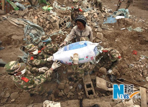 4月22日,武警战士帮助牧民铁尕把家中的财物从废墟中清理出来。新华社记者 费茂华摄