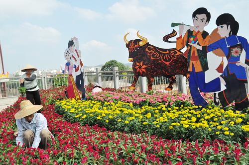 9月28日,园林工人在南宁市蒲庙大桥桥头摆放迎国庆花坛。国庆临近,广西南宁市街头和广场摆放的迎国庆花坛亮相。据悉,南宁用100余万盆鲜花配以各类艺术造型,在城市街头和广场摆放一批充满壮乡浓郁民族风情的花坛,为节日增添了喜庆祥和的气氛。新华社发(陆波岸 摄)