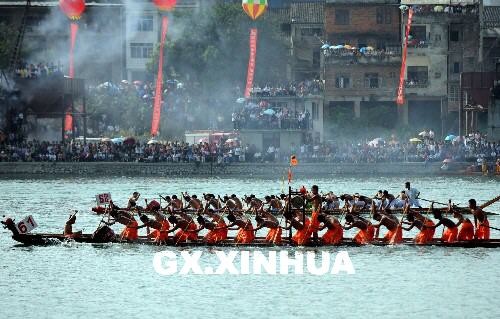 10月8日,激烈的龙舟赛引来众多苗族群众观赏。 广西融水苗族自治县的苗族群众素有在重阳节前后赛龙舟的习俗。10月8日,重阳节第二天,融水苗族自治县的近50支龙舟队齐集贝江水面,进行了精彩激烈的龙舟比赛。