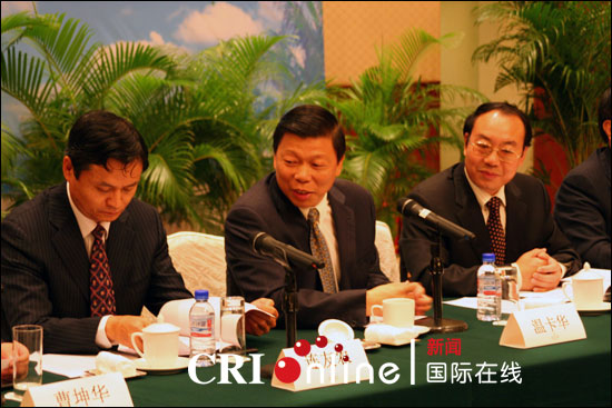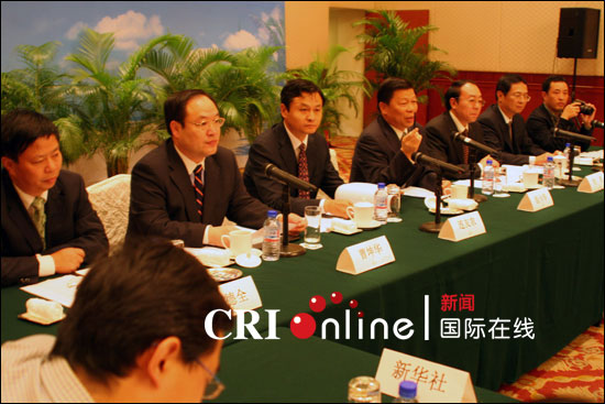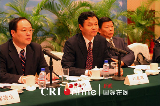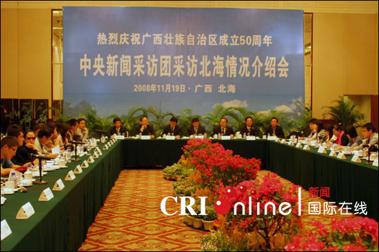 11月19日,北海市召开广西壮族自治区成立50周年中央新闻采访团情况介绍会。图中间者为北海市市长连友农。 国际在线记者 殷亮 摄