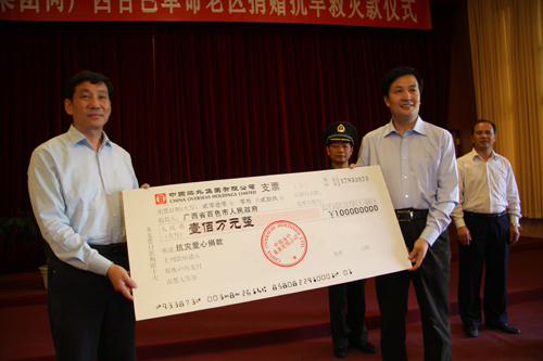 人民网百色3月31日电 (记者庞革平、谢建伟)3月31日下午,香港中国海外集团有限公司和广西百色丰林人造板有限公司分别向广西百色灾区捐款100万元。此前,上海浦东发展银行股份有限公司已向百色市捐款50万元,百色军分区及所属部队官兵则为百色市捐款10.29万元。
