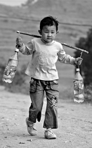 近日,云南石林县大石桥村,送水车来了,6岁的小孩杨云润用饮料瓶帮家里人挑水。黄兴能 摄