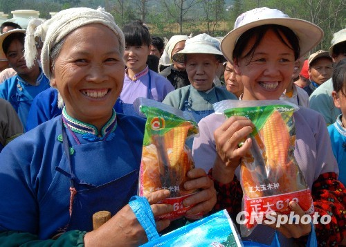 4月12日,在广西特大干旱县——那坡县龙合乡信合村田间地头,自治区农业专家将耐旱高产玉米良种赠送给受灾的农民。当日,广西壮族自治区农业厅在遭受特大旱灾的那坡县和凤山县举办“抗旱救灾种子”捐赠仪式,现场将从外省紧急采购回来的总价值48万元的3万斤耐旱高产玉米良种,赠送给两县遭受严重旱灾的3000多户农民,帮助他们抢种补种,恢复生产。中新社发喻湘泉摄