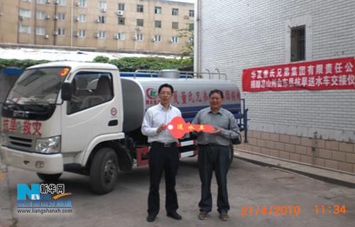 为了给灾区抗旱救灾尽一份力,华夏董氏兄弟集团有限责任公司无偿为我省捐赠两台价值7万多元的东风牌劲卡送水车,一台给攀枝花,一台给凉山,4月21日上午,根据全州受灾实际情况,凉山州外侨办将车送给了全州旱情比较重的会东县。