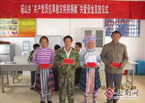 4月25日,河口县瑶山乡在八角村委会举行“共产党员抗旱救灾特别捐献”关爱资金发放仪式。共向八角村委会回龙、箐脚二个小组临时饮水困难户105户454人,发放关爱资金52500元。