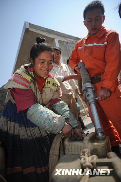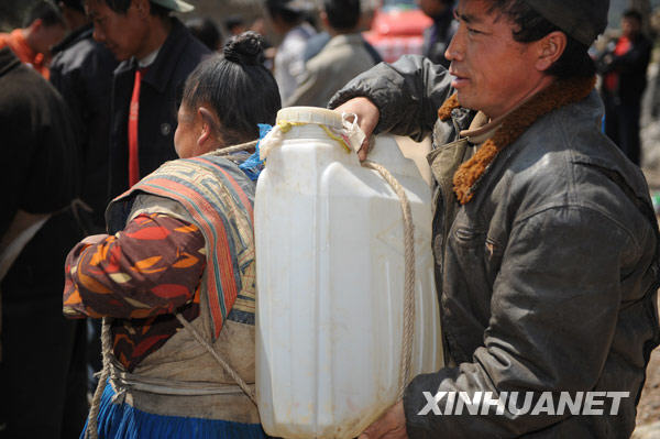 李正英在取水点接水,她的水桶能装50斤水(摄于3月27日)。新华社记者 刘续 摄