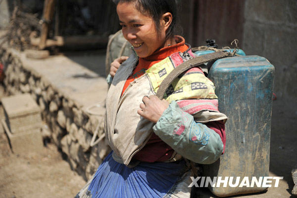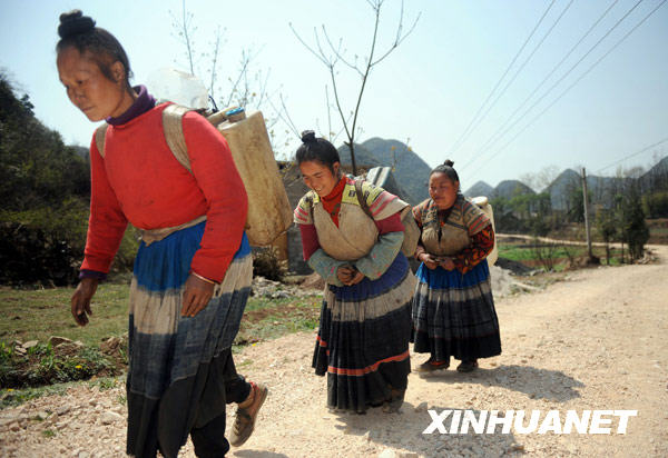 苗族妇女熊关英、李正英、赵华英住在海拔近2400米的贵州省水城县发箐乡发箐村。干旱发生后,当地政府开始为发箐村送水,互为邻居的熊关英三人每天都会结伴,沿着磕磕绊绊、急转弯很多的山路,往返步行近2公里取回生活用水。3月27日,记者和背着50多斤重水桶的三位妇女一同从取水点走回了家,体验并记录下这段艰辛的取水路。新华社记者 刘续 摄