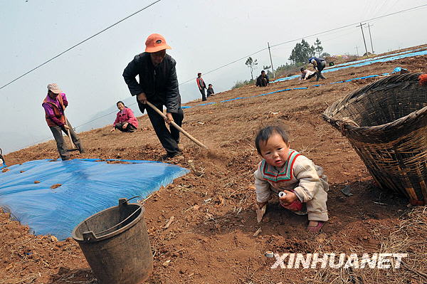 地处云南省宣威市的龙潭镇,自2009年入秋以来遭遇了三季连旱。在抗旱的田间地头,活跃着“抗旱妈妈”的身影。这些带着孩子的妇女既要照看小孩,又要浇水、耪地、育苗,吃苦耐劳的精神感染了抗旱一线的每一个人。新华社记者何俊昌摄