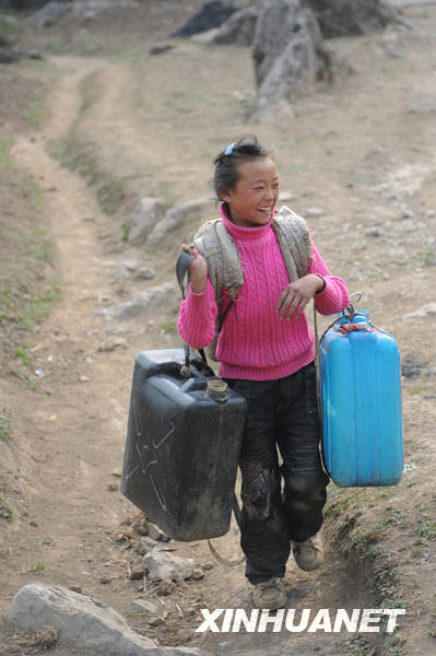 14岁的女孩熊国丽身上挂着3个空水桶走在去取水点的路上。(3月27日摄)