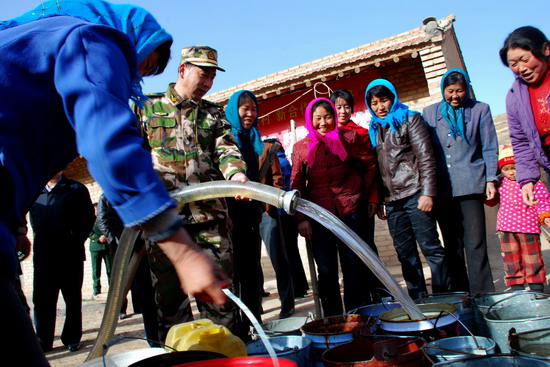 今年初到现在,宁夏西吉、隆德两县部分地区严重缺水,人民群众生产生活受到严重影响。3月31日以来,武警宁夏总队抽调44名官兵,15台车辆,赴缺水的宁夏南部山区抗旱支农。在隆德县,抗旱分队官兵每天从樊家峡水库取水送到县城,保障了城区20000多人的生活用水。在西吉县,抗旱官兵从县城取水,把水送到偏远的田坪、平峰、马建、兴坪、红耀等乡的学校、清真寺和敬老院及部分饮水困难群众家中,受到当地群众的热烈欢迎。武警宁夏总队抗旱救灾分队官兵共送水2400多吨,有效缓解了缺水地区群众的饮水困难,增强了群众抗旱自救的信心。