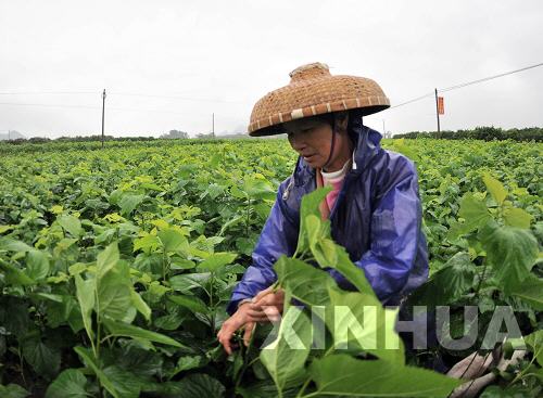 4月14日,广西上林县大丰镇云城村蚕农李爱芬冒雨采摘桑叶。
