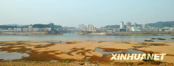 受浔江和西江上游及周边地区干旱影响,西江广西梧州段水位持续走低,市区附近江面可见大片裸露的河床。新华社发(何鎏 摄)