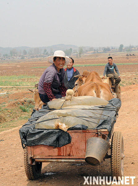 3月24日,宣威市营沟村一位村民高兴地坐在装满水的牛车上回家。云南宣威市积极开展抗旱活动,受旱地区群众情绪稳定。新华社记者 何俊昌 摄