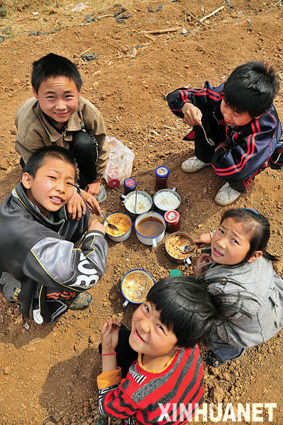 3月24日,宣威市干海完小的小学生在吃午饭。云南宣威市积极开展抗旱活动,受旱地区群众情绪稳定。新华社发(丁宪魁 摄)