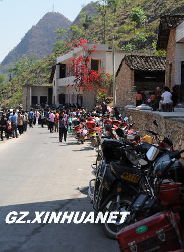 黔西南州积极落实贵州省委省政府提出的“确保每个群众有水喝、有粮吃”。图为黔西南州兴义市则戎乡的村民在迎接送水车队(2010年4月8日摄)。新华社记者 朱国贤摄