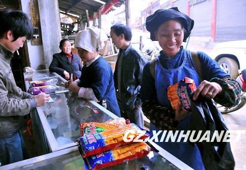 4月14日,贵州晴隆县学官村布依族妇女余才归(右一)在晴隆县鸡场镇购买玉米种子。新华社记者 黄勇 摄