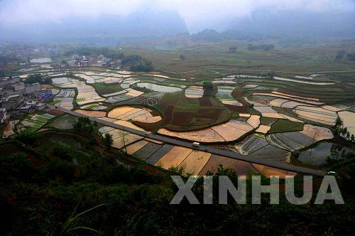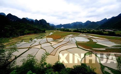 在河池市大化瑶族自治县贡川乡清坡村,稻田在雨中开始焕发生机。(4月17日摄)
