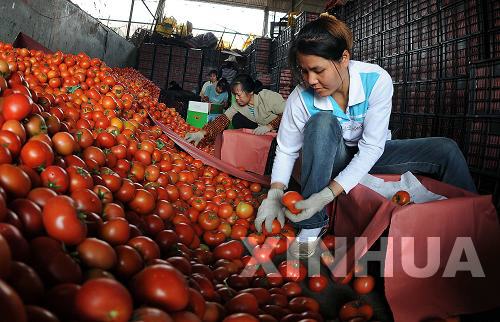 4月19日,广西田阳县农民在包装番茄准备外运。