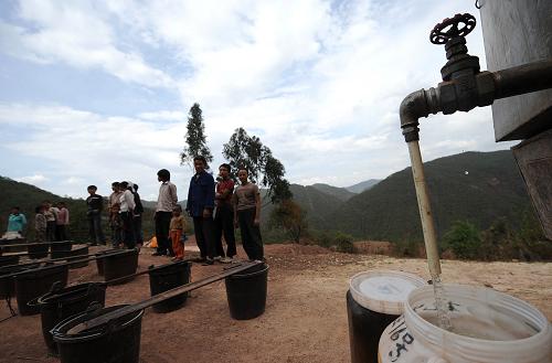 4月21日,云南省楚雄市东华镇达苴村的彝族群众在送水车前排队取水。新华社记者 蔺以光 摄