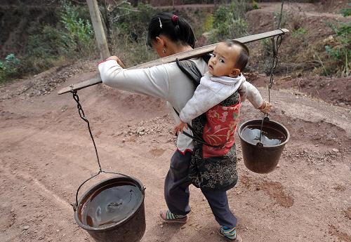 4月21日,在云南省楚雄市东华镇达苴村,一位背着孩子的彝族妇女把送水车送来的水挑回家。新华社记者 蔺以光 摄