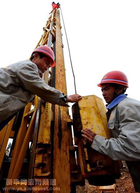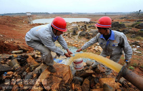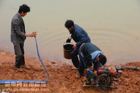 在云南省陆良县干旱重灾区大莫古镇戈衣村,一口由昆明勘察设计院抗旱打井突击队奋战20余天打出的200米深井,近日开始为干涸近半年的戈衣水库供水,以备春耕生产急用。新华社记者陈海宁摄
