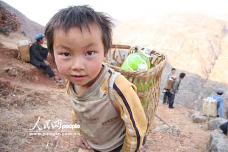 每天,村民们从海拔1800米左右的村庄出发,沿着一条坡度多在60度左右的蜿蜒的羊肠小道,步行下到海拔1100左右的牛栏江边,用肩挑背扛的方式运水回家。4公里左右陡峭的山路,青壮年劳力往返一趟也要两个半小时。