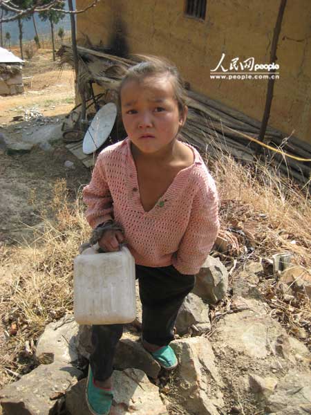 这是一个极度缺水的小村庄。持续干旱使村里的水窖全部干涸,小春作物基本绝收。由于交通极其不便,乡政府安排的送水车每天只能保证将8方左右的水送到村里的五保老人、残疾人等特殊困难人群家里,绝大部分村民需要步行背水。