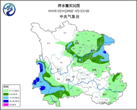 西南地区降水量实况图(2010年3月31日08时-4月1日07时)