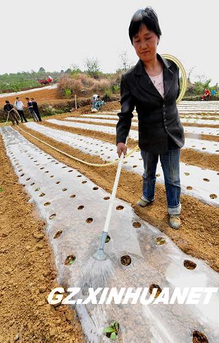 2010年4月12日,在贵阳市南明区永乐乡永乐村,村民朱熙成家正在用小水窖里的水浇萝卜秧苗。新华社记者 杨楹 摄