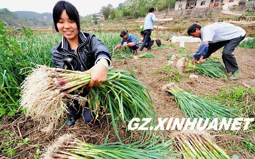 2010年4月12日,在贵阳市南明区永乐乡永乐村,村民在抢收青蒜。 新华社记者 杨楹 摄