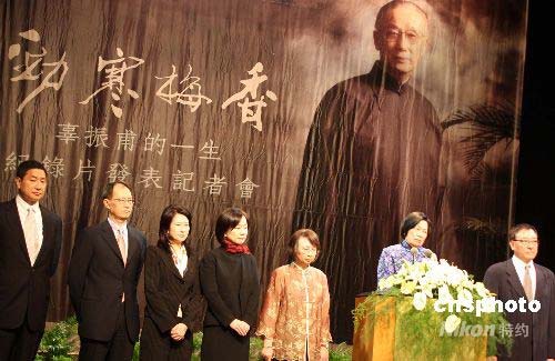 图为4月24日,“汪辜会谈”15周年前夕,《劲寒梅香-辜振甫的一生》纪录片在台北发表。前台湾海基会董事长辜振甫的家人一起出席记者会,致词者为辜振甫的夫人辜严倬云。中新社发 董会峰 摄