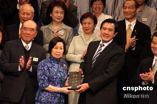 图为前台湾海基会董事长辜振甫的遗孀辜严倬云向马英九赠送纪念品。中新社发 董会峰 摄