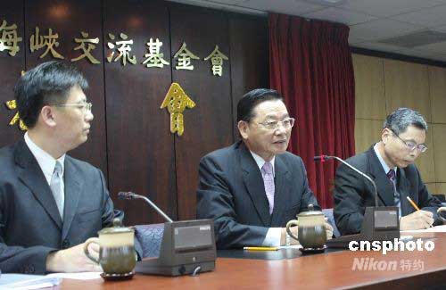 海协会与海基会即将恢复协商会谈。六月十日中午,海峡交流基金会董事长江丙坤(中)、副董事长兼秘书长高孔廉(右一),在海基会十七楼第一会议室举行赴北京商谈前的特别记者会。六月十一日,江丙坤将率代表团赴北京。 江丙坤说:“明天,我们开始进行的是一项举世瞩目的活动,大家都在写历史。”中新社发 耿军 摄