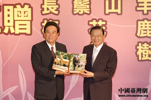陈云林江丙坤举行互赠仪式,陈云林向江丙坤赠送“团团”、“圆圆”图谱,江丙坤向陈云林赠送长鬃山羊和梅花鹿图谱。(本网特派记者田云鹏 发自台北)