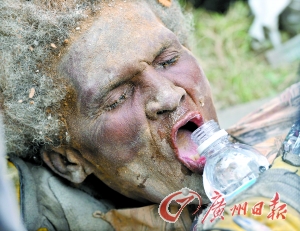 这名约69岁的妇女叫埃娜·齐齐,被救出后满脸灰土,饥渴饮水。