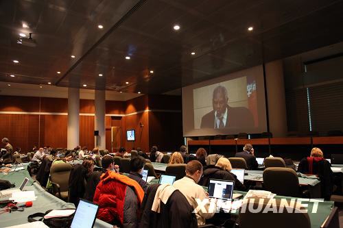 这是1月25日在加拿大蒙特利尔拍摄的海地震后重建部长级会议新闻中心(图中投影仪上显示海地总理贝勒里夫正在会议上发言)。海地震后重建部长级会议当日在此召开。新华社记者张大成摄