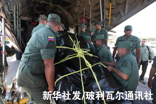 1月15日,在委内瑞拉迈克蒂亚的国际机场,委内瑞拉军人将救灾物资搬运上飞机。当日,委内瑞拉支援海地地震灾区的第二批救援人员携带救灾物资奔赴海地。第二批救援人员共29人,其中包括25名军方人员、2名地震专家和2名民防专家。新华社发/玻利瓦尔通讯社