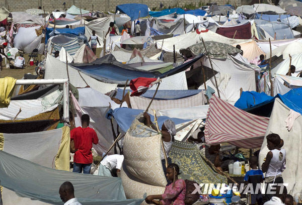 1月16日,在海地首都太子港一家公园内的安置点,灾民在帐篷里生活。新华社发(戴维摄)