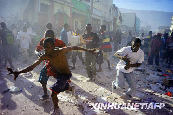 1月17日,在海地首都太子港,抢劫者躲避警方追击。海地地震发生后,因严重缺衣少食,许多不法分子,包括一些饥饿难耐的灾民在内,肆意持枪或拿刀抢劫财物。新华社/法新