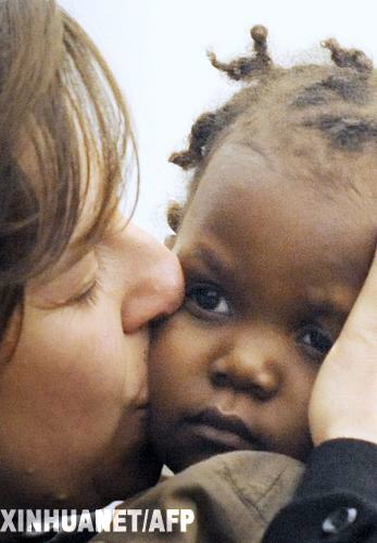 1月22日,在法国巴黎戴高乐机场,一名妇女亲吻她领养的海地儿童。新华社/法新