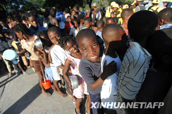 1月20日,在海地首都太子港,孩子们排队领取食物。 1月12日,海地发生里氏7.3级地震,造成人员伤亡和重大财产损失。国际社会纷纷伸出援手,向海地提供人道主义援助。新华社/法新