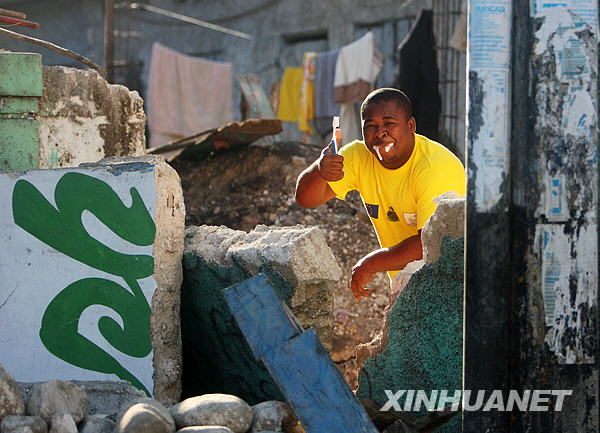 1月22日清晨,在海地首都太子港,一位男子在已经成为废墟的家中刷牙,看到记者拍照,他竖起大拇指朝记者微笑。 当日是海地地震后的第10天,海地人民正在从灾难的阴影中走出,努力恢复正常生活。新华社记者邢广利摄