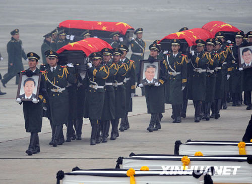 1月19日,礼兵护送八位烈士的灵柩,灵柩上覆盖着中华人民共和国国旗。当日,专程接运在海地地震灾害中遇难的八位中国维和警察灵柩的专机抵达北京首都国际机场。新华社记者金良快摄