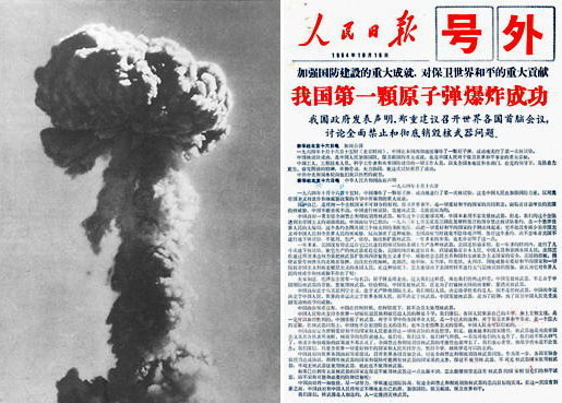 1964年10月16日15时,中国在西部地区爆炸了一颗原子弹,成功地实现了第一次核实验。