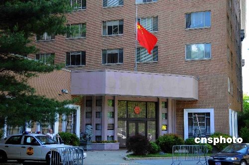 资料图片:中国驻美大使馆老馆——坐落美国华盛顿特区西北区的“温莎公园”旅馆。图为去年五月十九日,中国为四川地震死难者进行全国哀悼的第一天,驻美大使馆降半旗悼念死难同胞。 中新社发 邱江波 摄